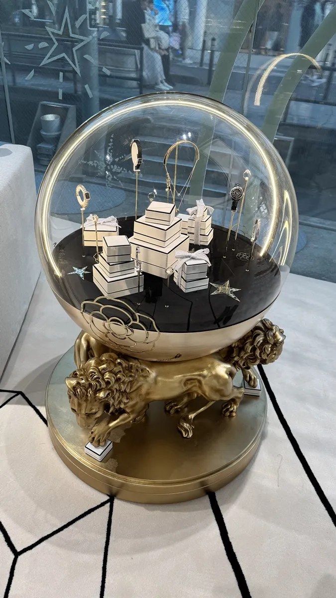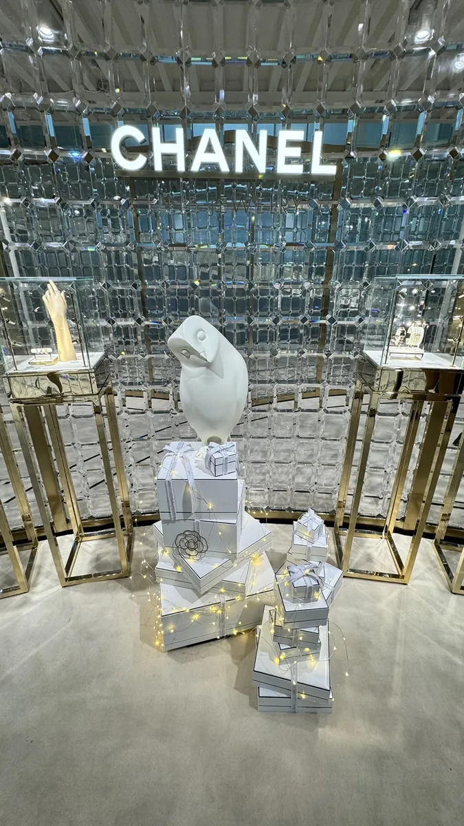 The owl, surrounded by piles of gift boxes and lights, is like a "storyteller" guiding visitors through the story of Chanel.