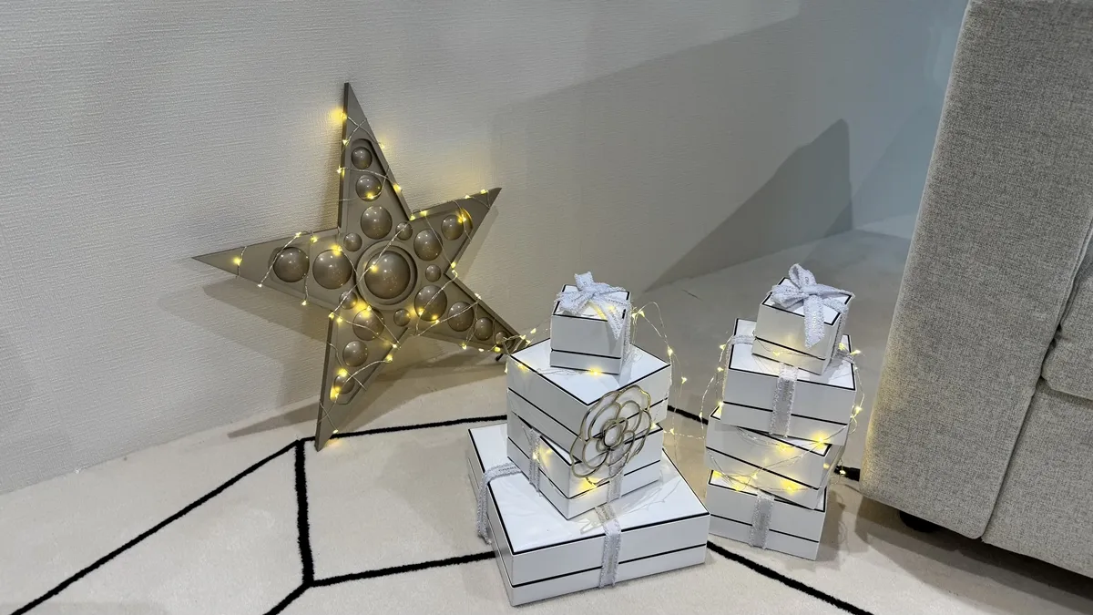 Gift boxes, star-shaped objet d'art, lights, glass walls, and more,