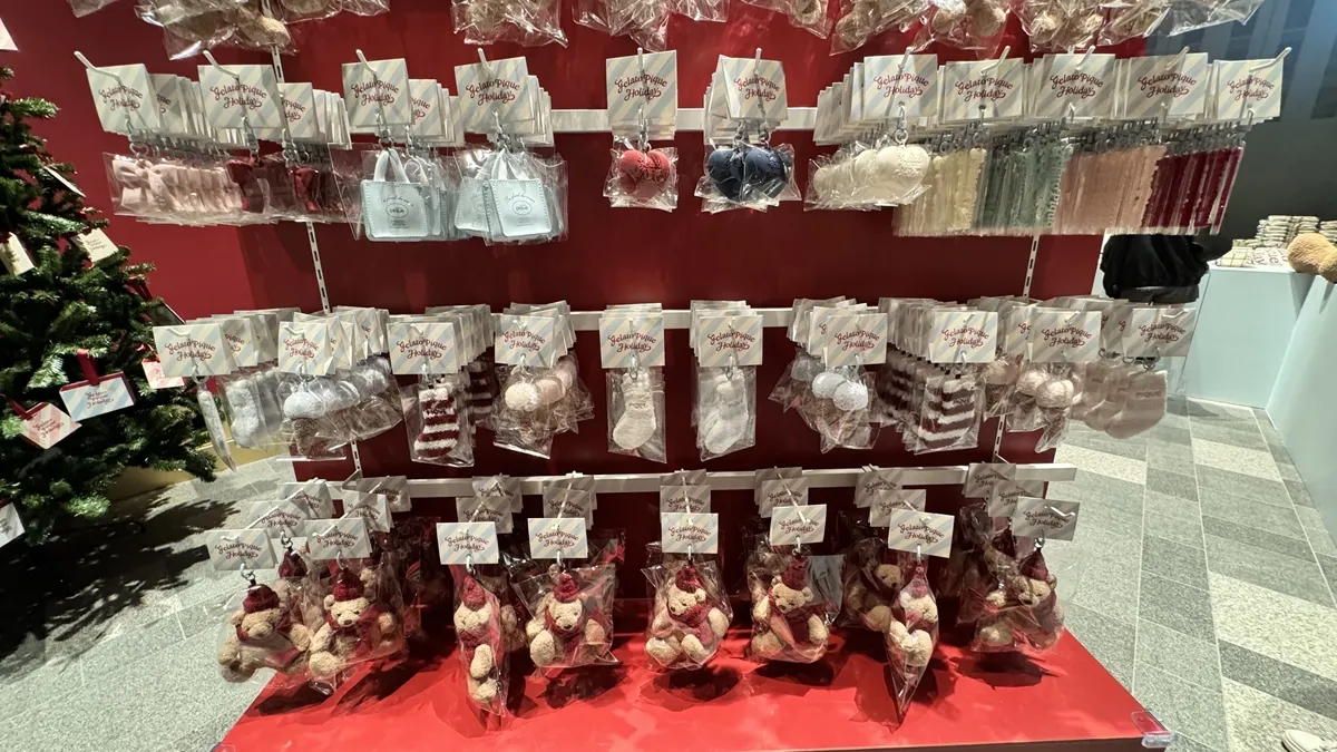 Along the back wall, a holiday limited edition capsule toy (gacha) corner is lined up.