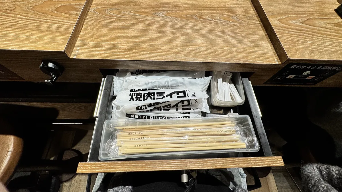 Hand towels, chopsticks, and toothpicks are neatly stored in drawers on the counter,