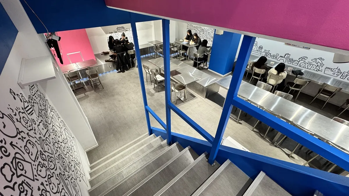 The walls are decorated with Korean character-like artwork, giving the space the feel of a Seoul café.
