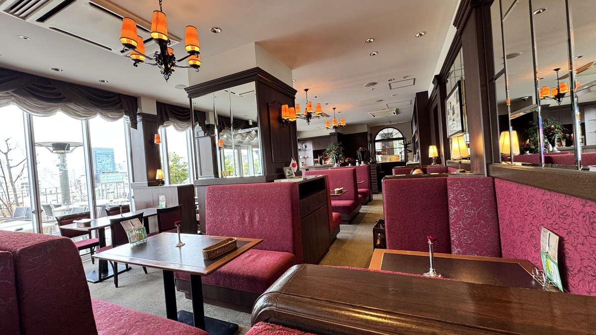 店内は明るい日差しが降り注ぎ、ボルドーのソファーが並ぶ上品な空間。年齢層はやや高めで、静かにゆったりとした時間が流れていました。