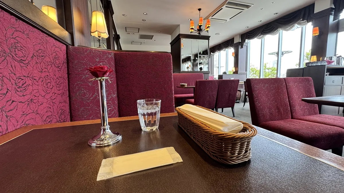 各テーブルに飾られた小さな赤いバラが印象的。