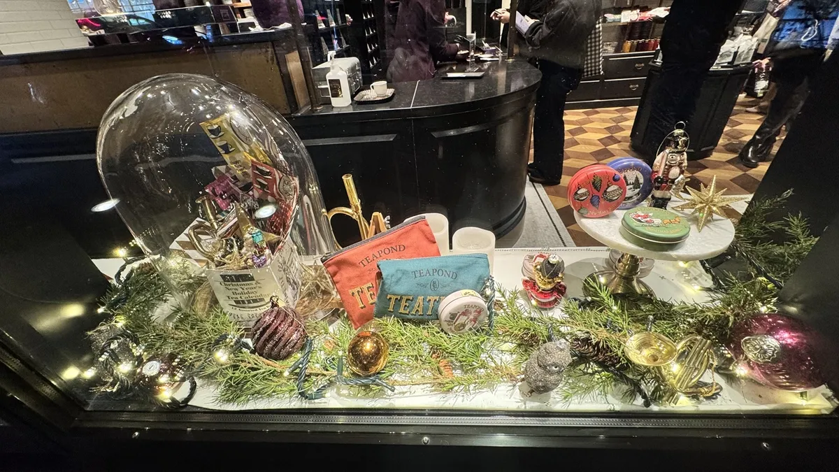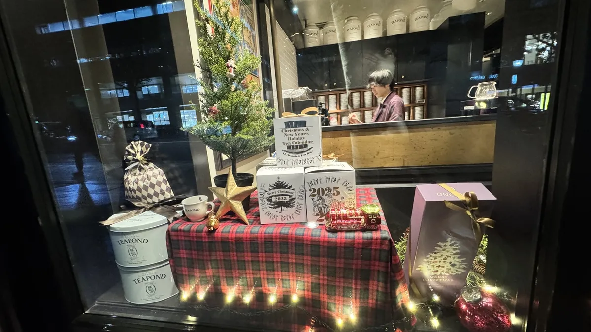 店内のショーケースには、限定パッケージのティーバッグや缶が並び、松ぼっくりやリボンなどのホリデー装飾が細やかに施されている。白いティー缶とクリスマスカラーのコントラストが美しく、写真を撮りたくなるような可愛さ。棚の上にはクリスマスギフトのセットも配置されており、どれを手に取るか迷う時間すら楽しい。