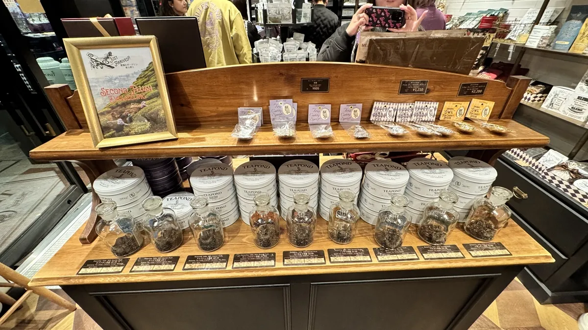 黒とウッドを基調とした落ち着いた空間で、白いティー缶が並ぶ光景は写真映えも抜群。 - 季節限定商品が特に強い