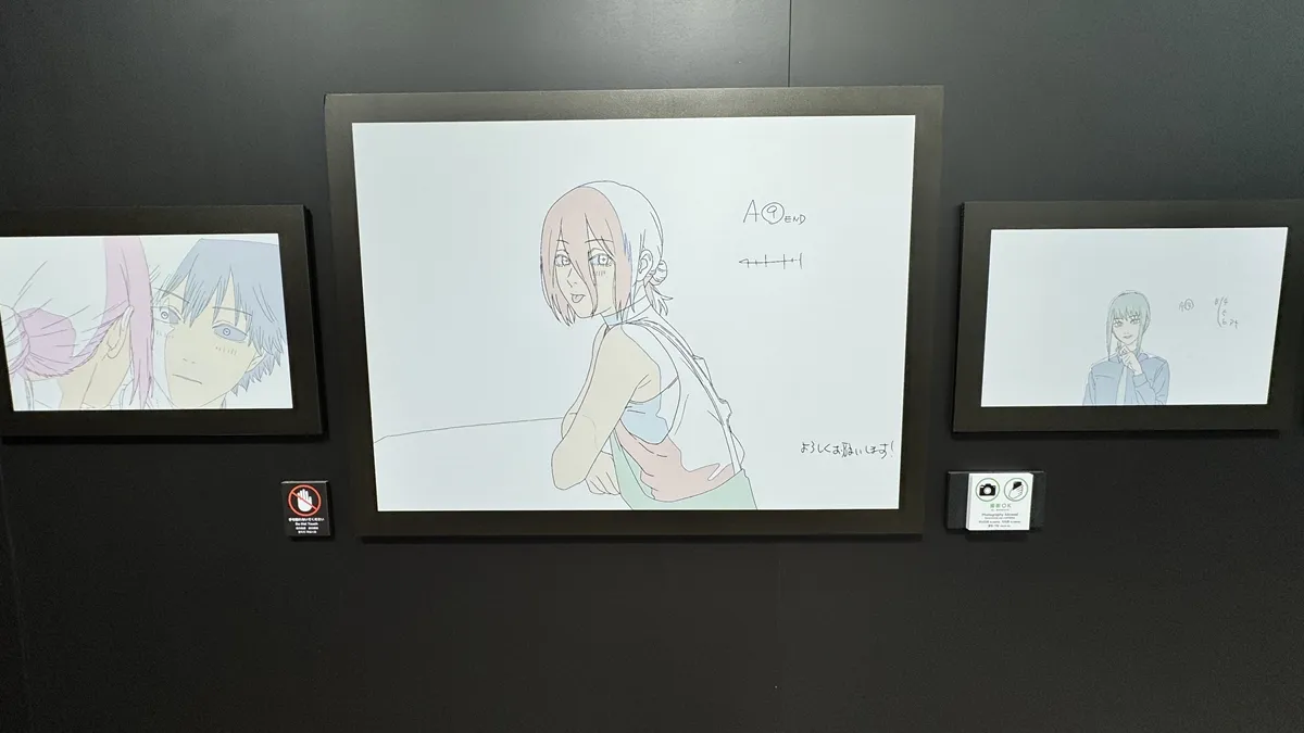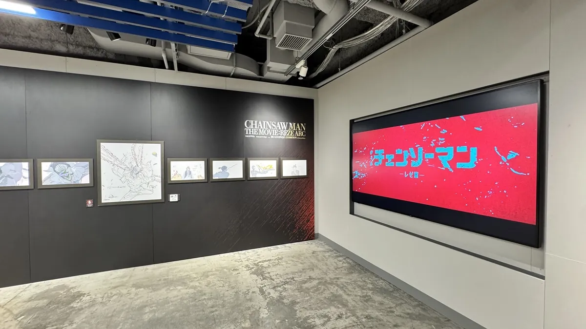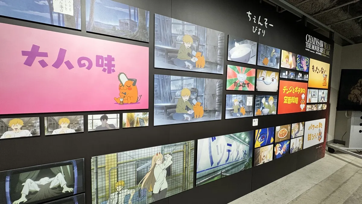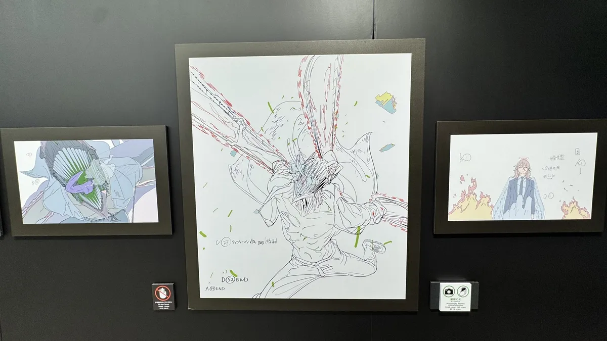 会場内の壁一面には、MAPPA監修によるアニメ設定資料や原画がずらり。デンジやマキマの戦闘シーン、レゼの印象的なカットなどが展示され、制作の裏側を間近で体感できます。