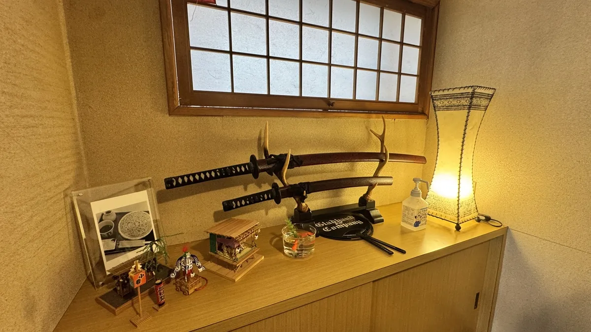 格子戸をくぐると、入口には刀のオブジェや提灯のミニチュア、柔らかな光を放つランプ。