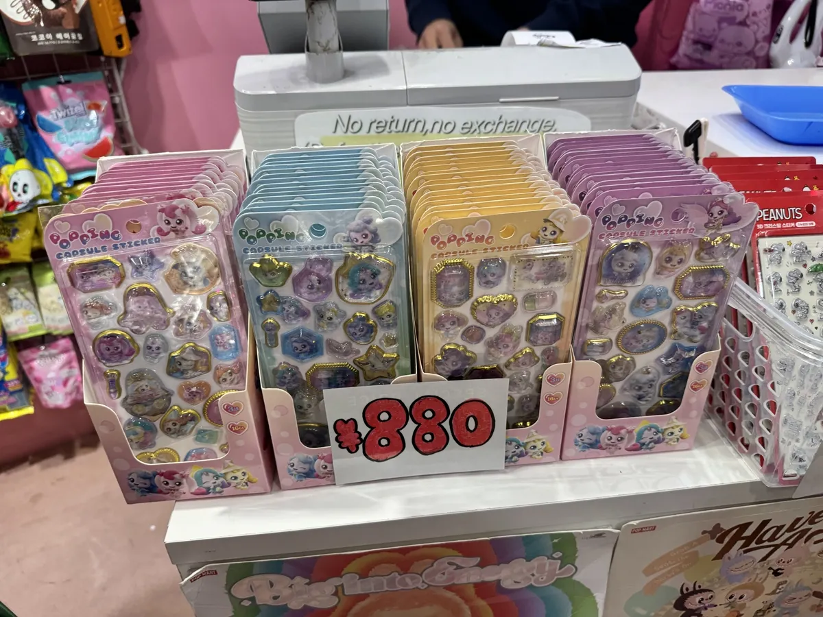 平日でも行列ができる人気ぶりで、韓国雑貨やファンシー系トレカデコにぴったりな商品が揃っています。