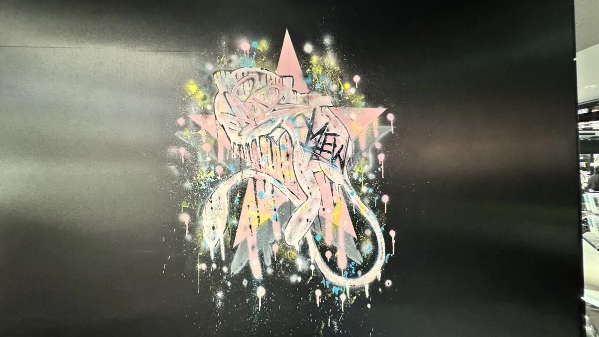 壁にはグラフィティ風のミュウのアートもあり、デザイン性の高いイラストが並びます。