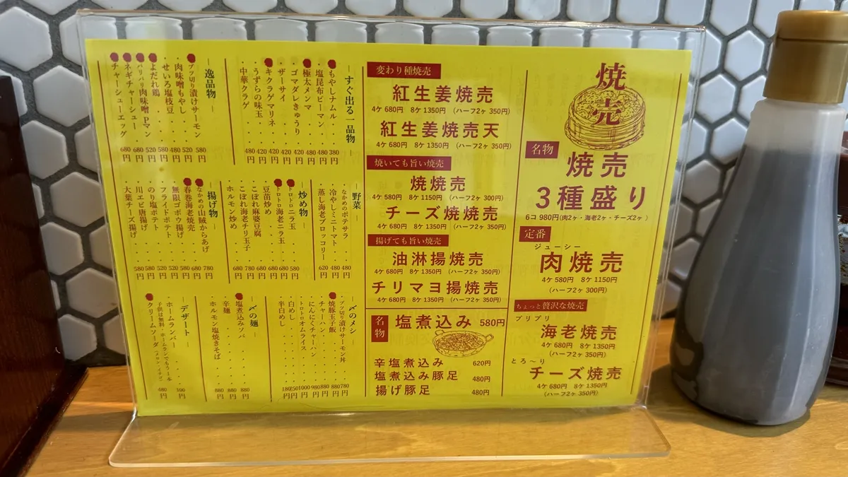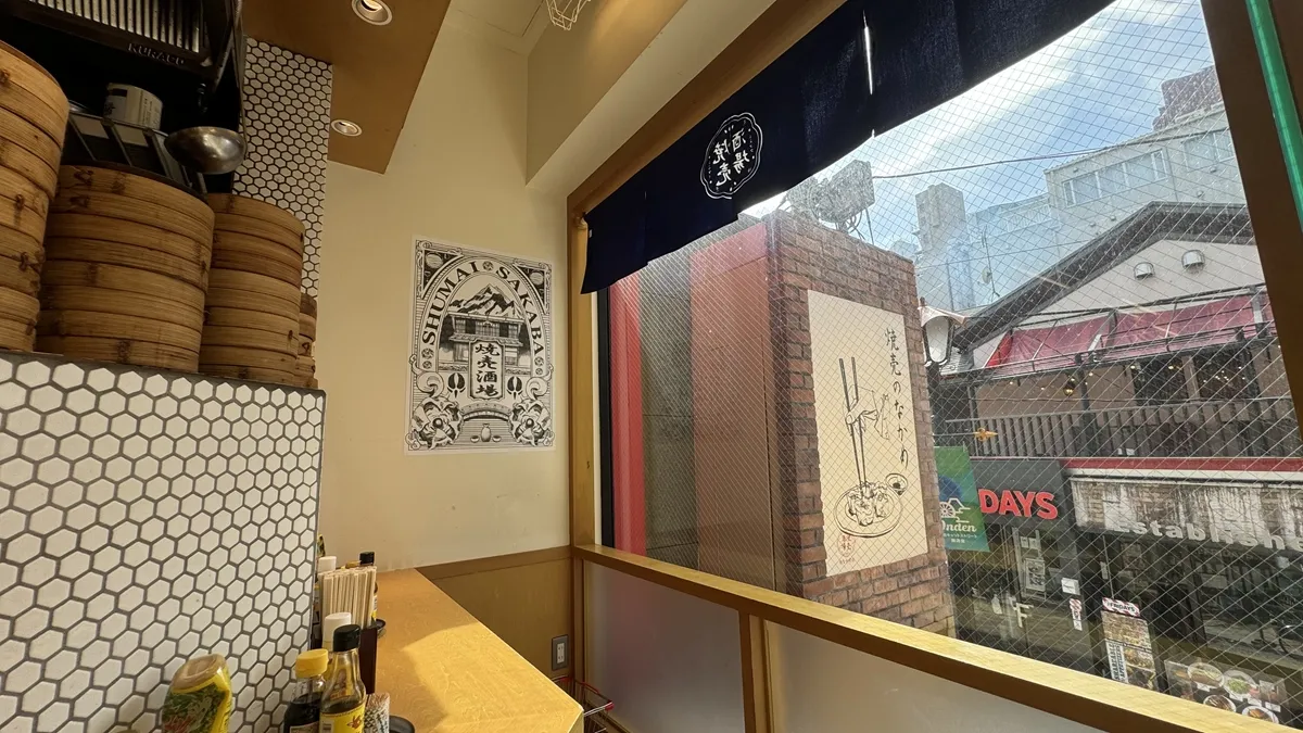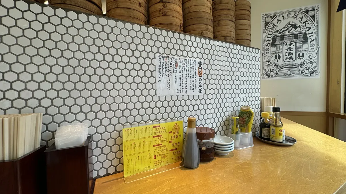 お店の名物はもちろん“焼売”。昼はランチ、夜はお酒と一緒に楽しめる酒場スタイルで営業しています。レンガ調の外観に「焼売」の暖簾が目印で、女性一人でも入りやすい雰囲気です。