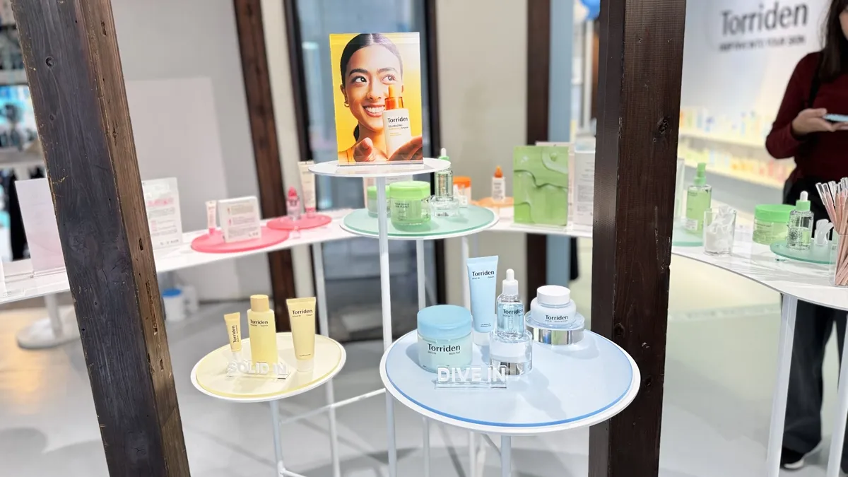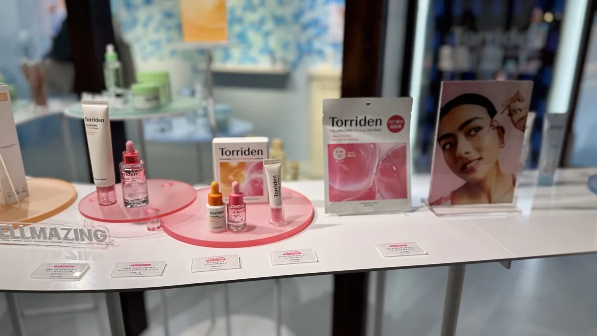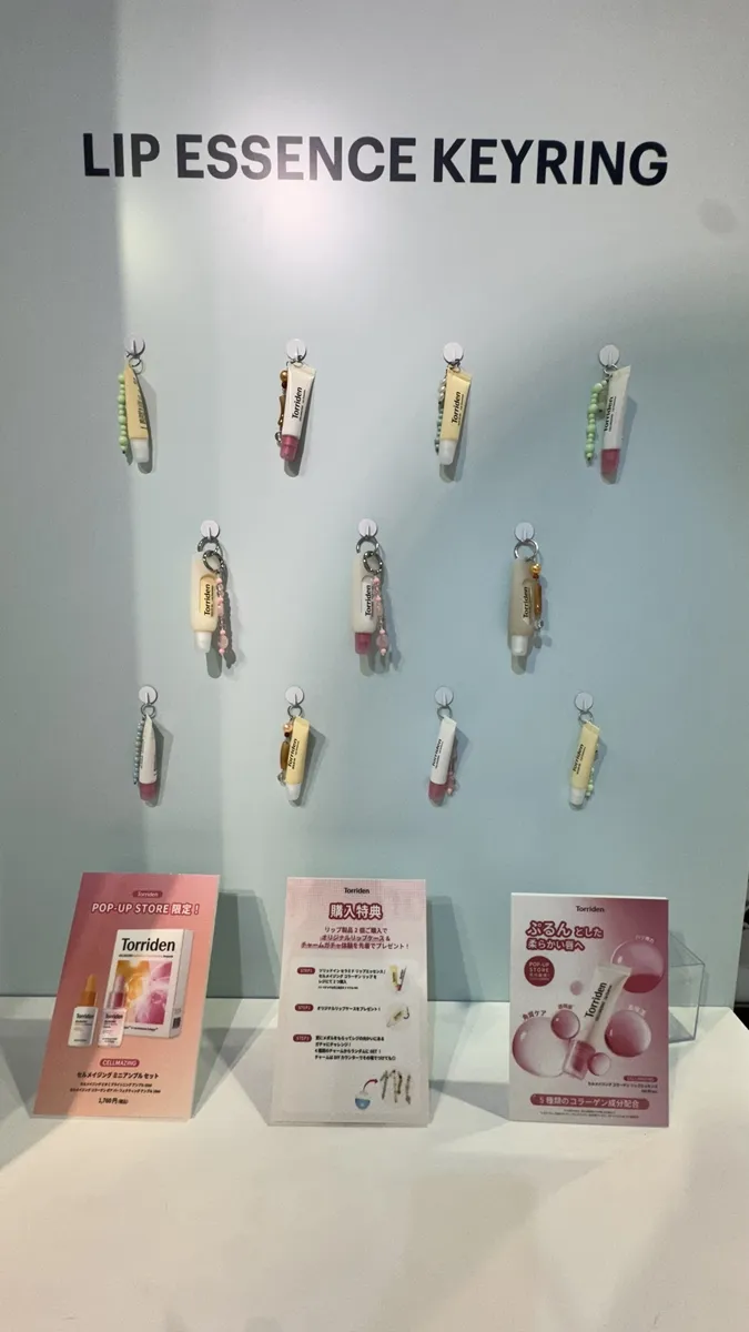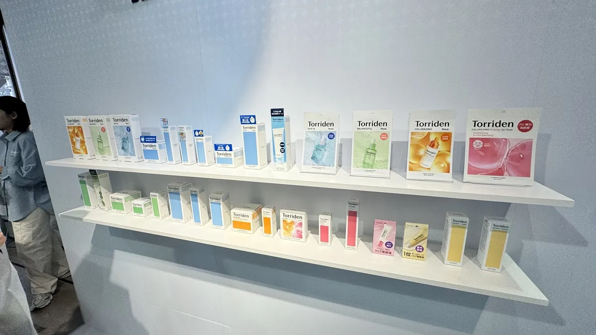 Torridenのスキンケアラインがカラーごとに展示されており、自分の肌悩みに合わせて見比べやすい構成でした。