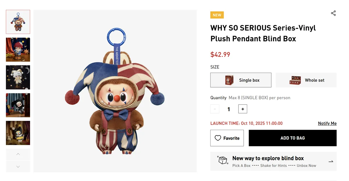 2025年10月9日(木)19:00(PST)、POP MART公式オンラインストアにて 「WHY SO SERIOUS Series – Vinyl Plush Pendant Blind Box」 が登場。価格は 42.99ドル。